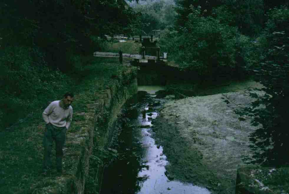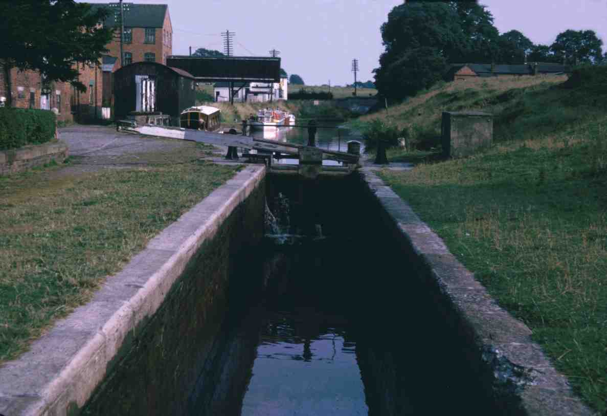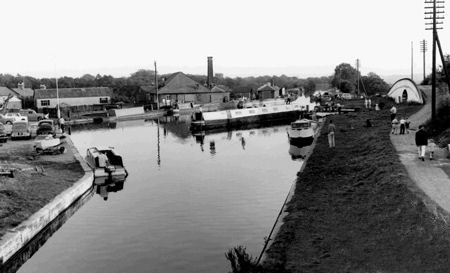 After breakfast, we negotiated the two Beeston locks which were followed shortly after by Tilston Lock. Just before Bunbury staircase locks was the "Golden Line" hire cruiser base (later Dartline, Watertravel and now Anglo Welsh Canal Cruisers). On approaching the lock a piece of discarded rope wrapped itself around the propeller and stalled the engine. As the “Kathleen” did not possess a weed hatch, Father decided to tackle the problem in a very unorthodox manner. We pulled the boat into the bottom chamber of the staircase lock using the ropes and filled the chamber up to the intermediate level. When the intermediate gates were opened Father boarded the boat and we pulled it into the upper chamber. Instead of closing the intermediate gates and filling it, Father instructed us to leave the intermediate gates open and open the bottom paddles, draining the top chamber completely. When the boat was sitting on the floor of the chamber, he told Mother and I to close the paddles, took his shoes and socks off, rolled-up his trouser legs, swung his legs over the side of the boat and dropped down to the lock chamber's floor. He squelched through the mud on the bottom of the lock chamber to the stern of the boat, cleared the propeller with his penknife (which was always kept extremely sharp), climbed back aboard the boat, instructed us to close the intermediate gates and open the top paddles to fill the lock in the normal fashion. When the water level had risen sufficiently he rinsed his feet in the canal water and dried them. I can't remember what the lock keeper said, but I don’t think it would be allowed today... even on a canal like the “Shroppie” that possesses a good water supply. Apparently, this trick was widely used by the boatmen of working narrowboats but we did not know that at the time. Father said that it seemed to be the common sense thing to do under the circumstances.