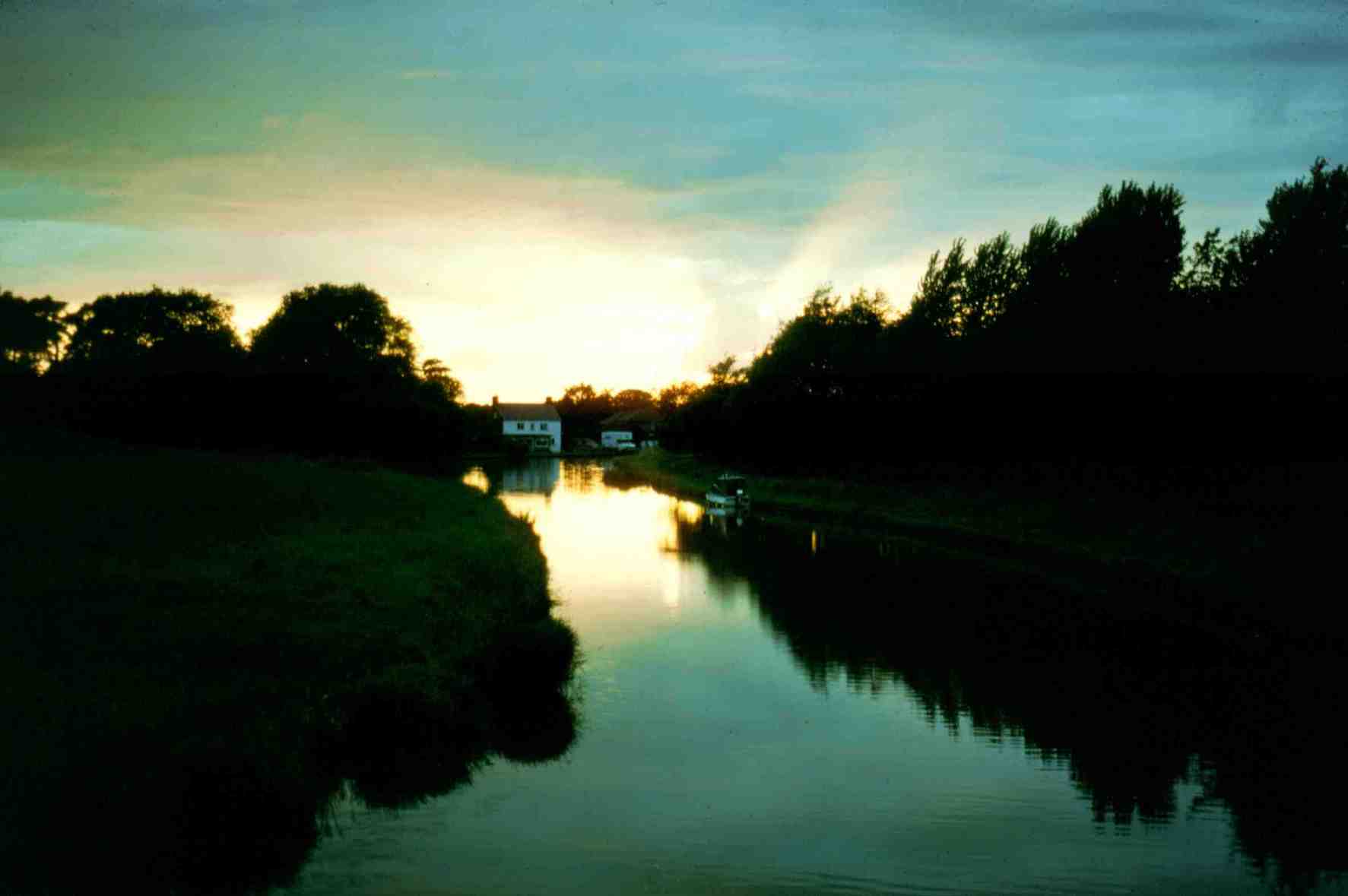 "Phial" (in the middle distance) moored at sunset taken from Bridge 99 at Barbridge on the "Shroppie"