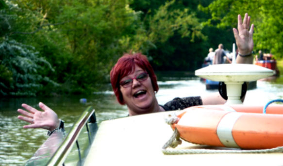 Ange on the front deck whilst cruising down the Runcorn Arm