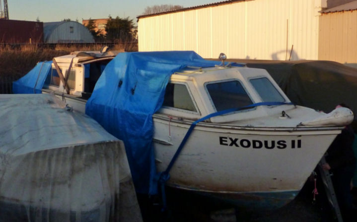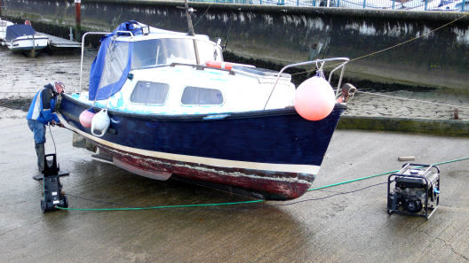 A boat owner at Ryde Marina power-washing his boat prior to repainting