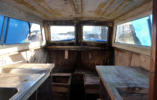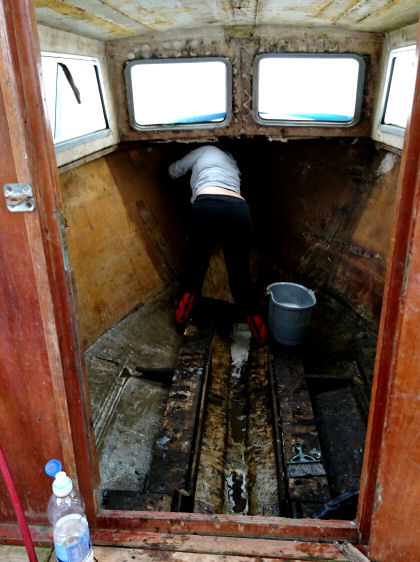 Lisa on her hands and knees cleaning the stripped front cabin of Adeline
