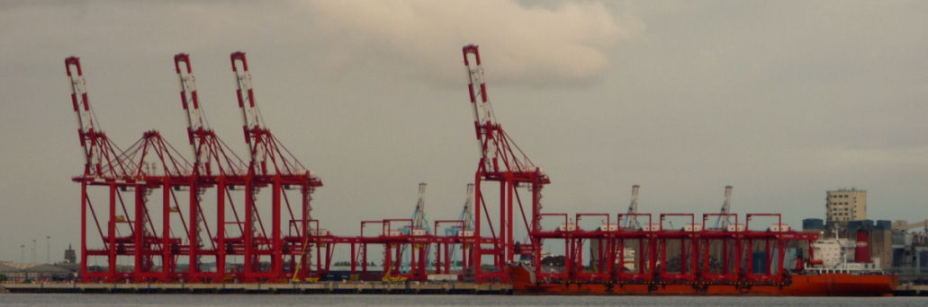 Regular readers might remember that I reported on the delivery of five giant container cranes to Peel Holdings' new container berth at Seaforth known as Liverpool 2. Well completion of the terminal came a step closer this week with the delivery of another six container cranes... albeit smaller examples than the previous delivery. They came welded to the deck of the 233 mtr long Zhenhua 25 heavy lift ship, specially converted from a redundant oil tanker 30000+ km (18000+ miles) from the Zhenhua Heavy Industries Company (ZPMC) manufacturing facility in Shanghai. The photograph below and the first one featured in Canalscape Book 11 will be published in "Mersey Connections".