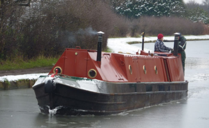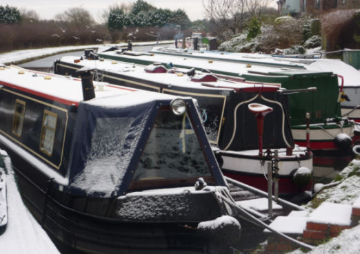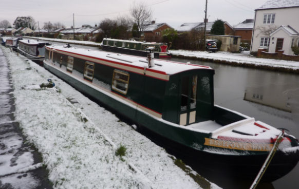 Our first visit to Lymm in 2016 was on the 16th January when we braved the cold weather to check on the boat and do a couple of jobs. On arrival the canal was frozen but the ice wasn't very thick. Our mooring was not frozen due to the land drain that runs down the location of the old gas works arm that once branched off the canal here.... hence the increased width of the canal. Even so we turned on the central heating and whilst we waited for the boat to heat up did a few jobs and then had lunch. We decided to stay on board overnight and after tea it started to snow quite heavily.
