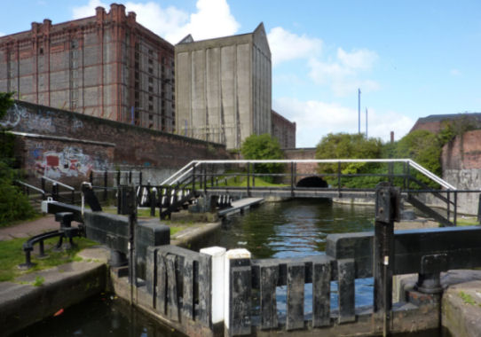 Bottom Lock in the Stanley Flight overshadowed by the massive Stanley Dock Tobacco Warehouse