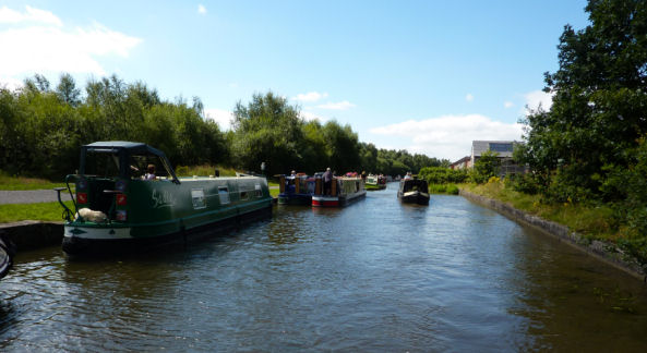We had to be at Plank Lane for 2.00pm the following day. It was about a two hour cruise so we planned to set off about 11.00am. We all had planned to wear our tie-dye t-shits and after breakfast everyone posed for the Leica. We set off in the lovely sunshine and made good time, arriving at Plank Lane about 1.00pm. There were six boats in front of us but on the other side of the bridge the queue looked considerably longer. We had lunch whilst we waited for the C&RT personnel to arrive. 2.00pm on the dot they turned up and instructed us to be ready to go through the bridge as soon as it was raised. Once safely through the bridge we were astounded at the queue on the other side which stretched for nearly two kilometres.