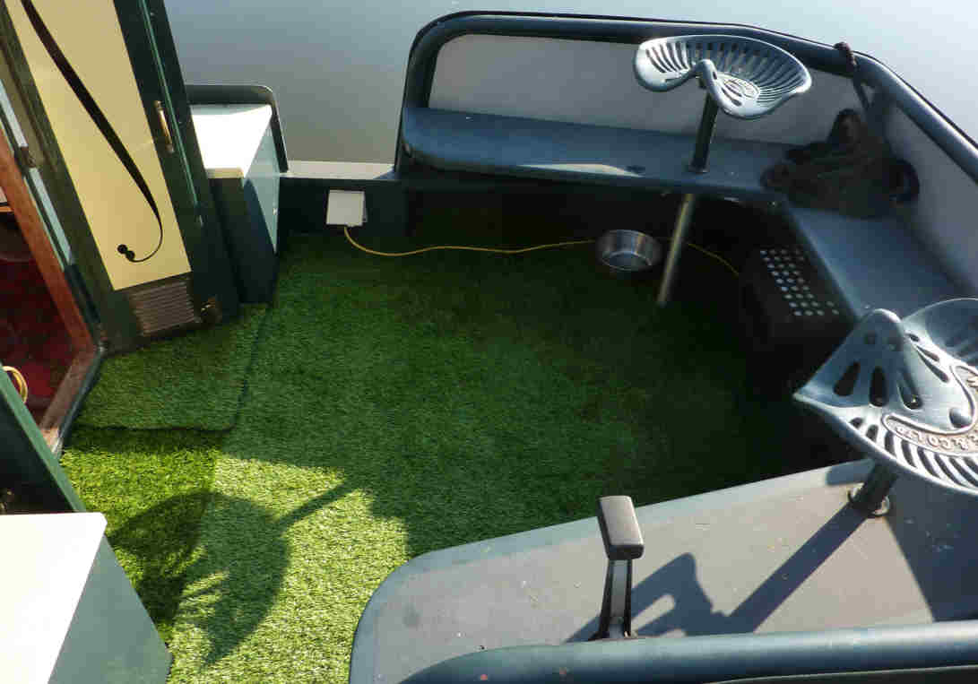 The week before we were due to go on our summer cruise I took a day off mid-week to finish the starboard side T-Cutting and polishing. I was blessed with perfect weather... dry, and not too hot. We were worried about Ruby burning her pads on the aft deck boards when the sun had been shining on them. Accordingly, we bought some inexpensive artificial grass to cover the aft deck with. This was fitted on the Saturday evening, after we had tea with Paul and Wendy, when the day started to cool-down. Even so, the sweat was running down face, into my eyes and stinging them. The rear doors had insufficient clearance between them and the deck boards but I had already thought about this and cut a diagonal slit where the doors would be when they were open which did the trick. The end result was exactly what we had wanted even though the strands of the grass were a little longer than we would have liked. Another benefit would be that the engine would be a bit quieter as well. The artificial grass could be tolled-up from either end it the engine compartment or weed hatch was to be accessed.