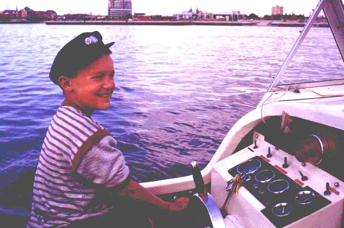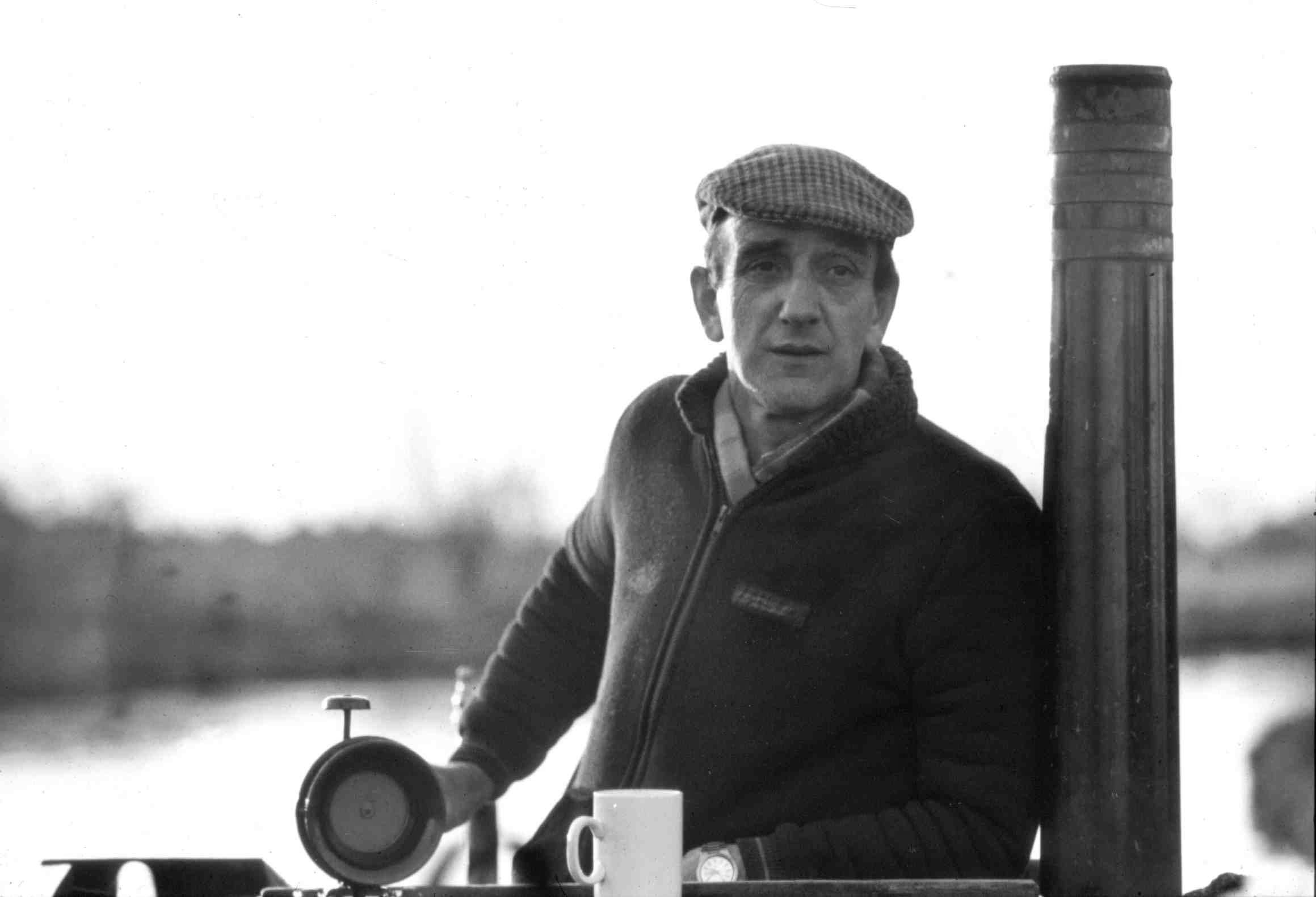 Alec Levac at the tiller of "Tamar" on the Bridgewater Canal at Grappenhall