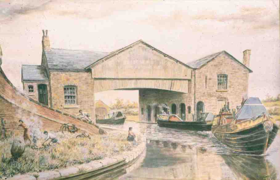 A painting by an unknown artist of Barbridge Junction showing the warehouse that spanned the "narrows"