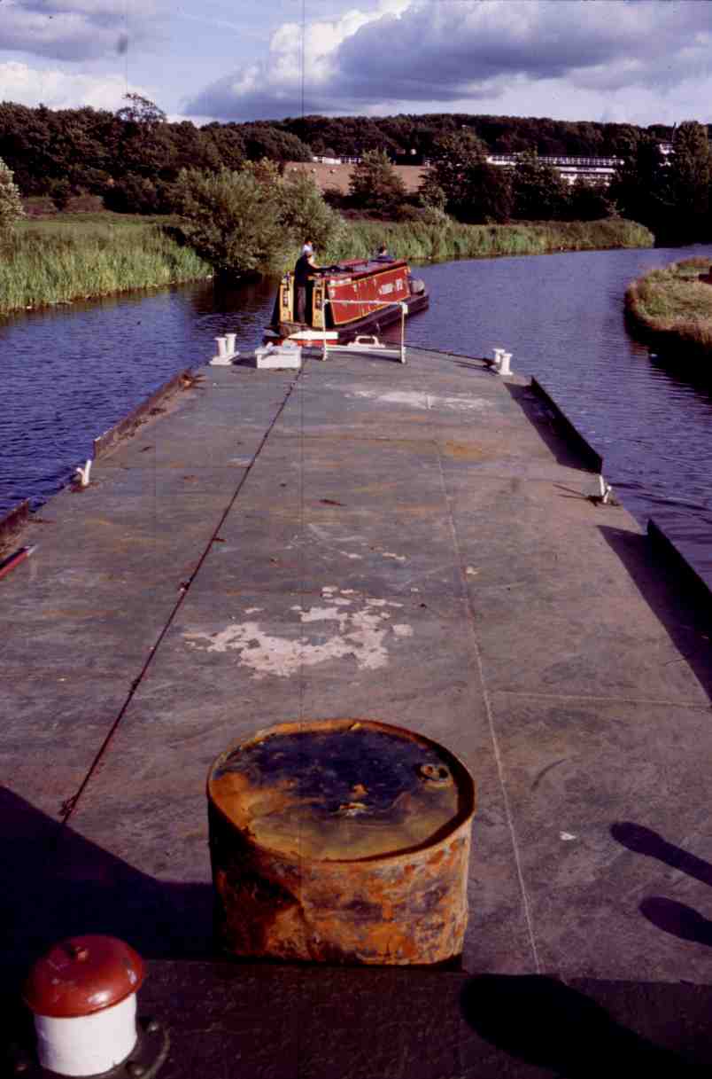 Whilst the boat was out of the water, it did not stop our cruising activities. Mike Webb, manager of the Manchester Ship Canal Company’s Bridgewater Department, had approached Alec and asked him if he would like to tow a full-size Bridgewater barge (Works Float No 3 or WF No 3 for short) from Worsley to Runcorn with “Tamar”, a task that the craft was ideally suited to do. Alec naturally said yes to Mike Webb and also asked us if we would like to come along to help. We also said yes and were recruited into “Alec’s Barge Moving Crew”. We went up to Worsley on the Saturday and found the barge easily. “Tamar” was winded and we tied-up for the night next to the barge adjacent to the footbridge. The next morning, we were up early, had our breakfast and prepared for the long haul back to Runcorn. I was designated as the steerer of the barge, we then connected a towing line between both craft and off we went.