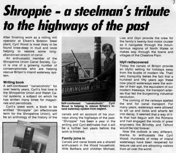 Whilst mentioning Bidston Steel, around this time I had started writing my first manuscript... "Shroppie" about the Shropshire Union Canal. Cliff Law... the Personnel Manager at Bidston Steel wrote an article publicising my activities for the "Elkem Echo"... Bidston Steel's in-house magazine. I must admit that he used some "artistic licence" in the article which is reproduced below.