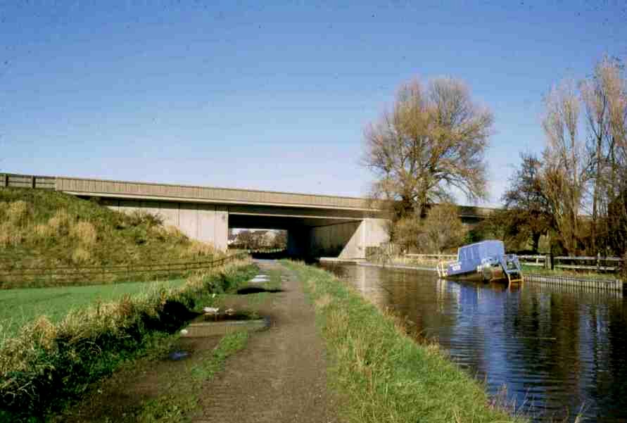 Leaving the village behind, the River Douglas, which has kept the canal company for quite some time, can be glimpsed through the gaps in the trees, following the course of the canal almost exactly. After passing the Navigation Inn, the M6 Motorway viaduct looms in the distance. The motorway crosses not only the canal but also the River Douglas and a railway line, which crosses the canal diagonally beneath the viaduct.
