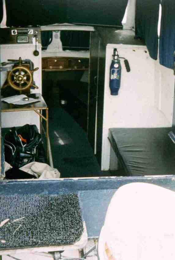 There was one incident that occurred that winter that I would rather forget. The ceiling and interior of “Misty Waters” was covered in expanded polystyrene tiles. Not only were they unsightly but flammable as well. I had decided to cover the interior with a thin brown carpet. The logical way to attach the carpet was to use impact adhesive. It was a long, messy job and took many hours of patiently cutting the individual pieces to fit, then gluing them onto the exposed glass fibre inside the boat.