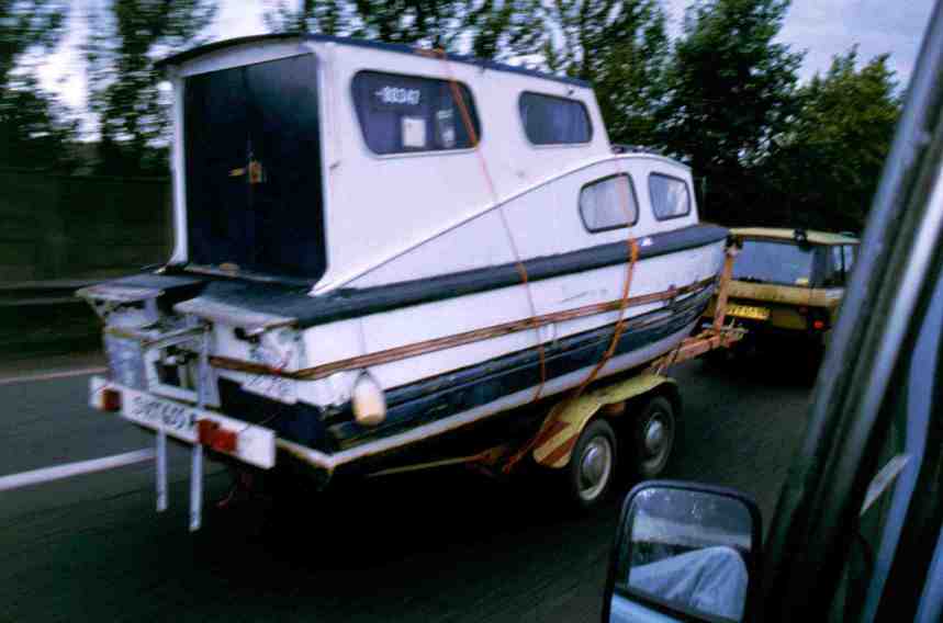 I had decided to take “Misty Waters” out of the water for the winter to clean and inspect the underside of the hull and repair some accident damage to the bow that the previous owner had not completed to my liking. The opportunity was also taken to paint from the rubbing strip down with red two-pot polyurethane paint. A trailer was borrowed from someone on the marina and the boat slipped out. It was towed to the opposite side of the marina where there was hard standing. The hull was completely cleaned and left to dry-out.
