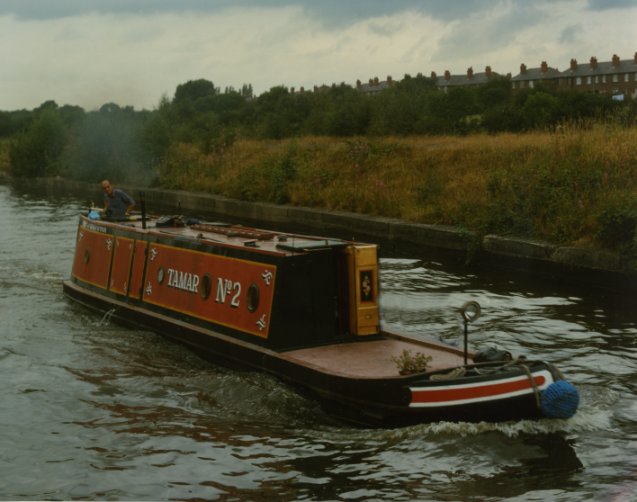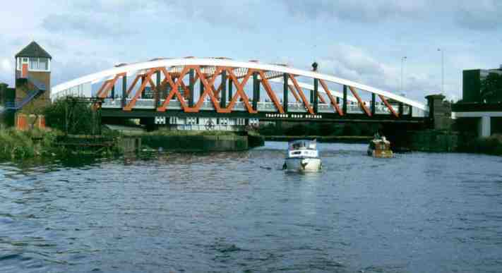 At first, I was a little apprehensive about passing moored craft, especially the fibreglass cruisers on linear moorings. We passed through Worsley and Patricroft without any incidents to be confronted by our first obstacle… Barton Swing Aqueduct. The aqueduct was negotiated without any problems although it was a little tight width-wise. The wide, clear waters of Trafford Park were lined with fishermen, obviously disgruntled by “Tamar’s” wash as the engine was working quite hard pulling the barge. Fortunately, we did not meet many craft out cruising and what few we did meet were very sympathetic to the lack of manoeuvrability and gave us a wide berth.