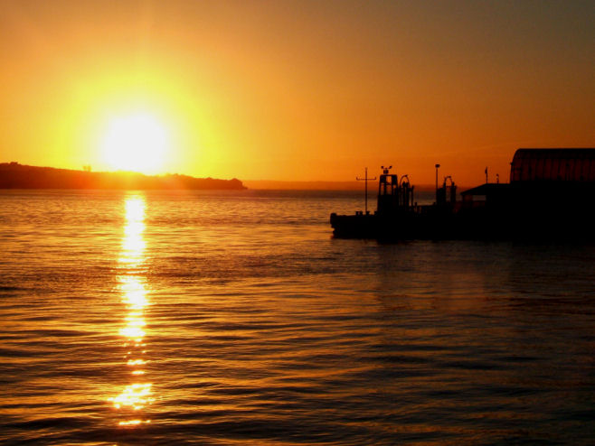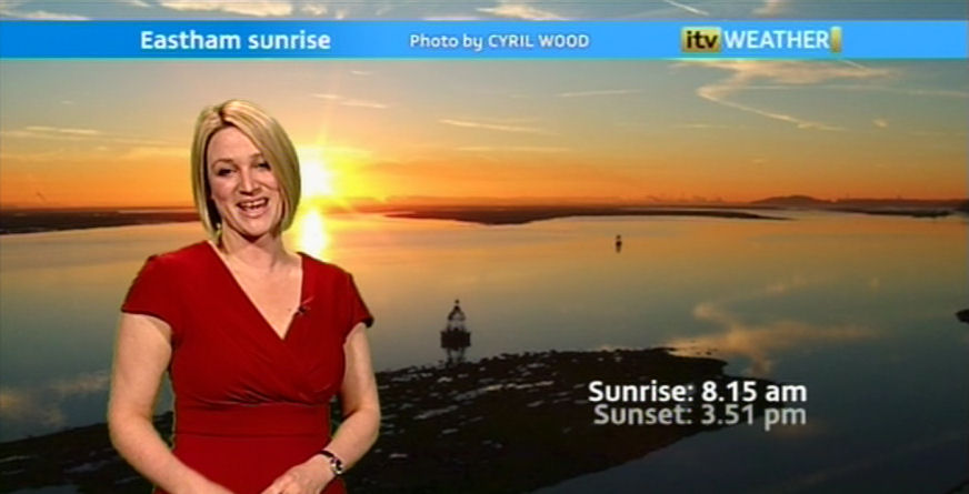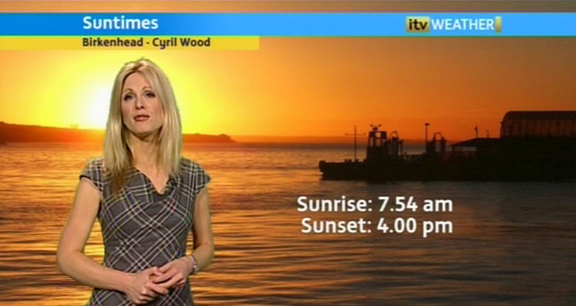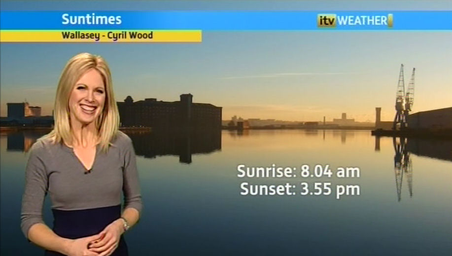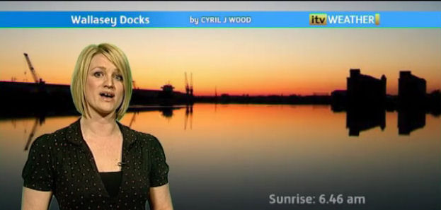 On the way home from work later on in the week I was crossing the bridges leading to Wallasey and saw the sun setting over Wallasey Docks. Needless to say I had to stop and take photographs. The resulting photograph was sent to Granada Reports who used it as a background to their weather report. Below is a screenshot of the weather feature with a full-size version of the photograph.