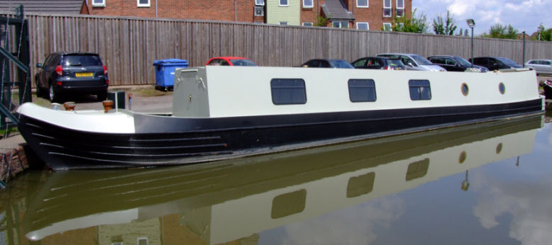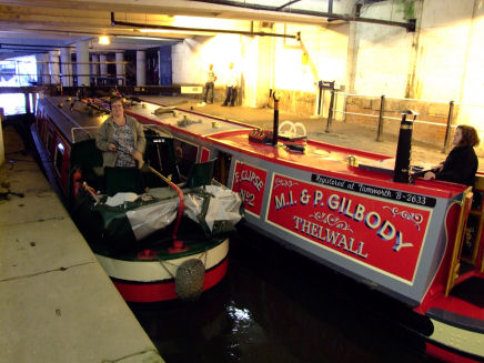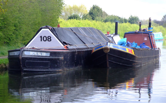 Longford Canal Services narrowboat "Ariel" with their new butty "Joe" breasted-up at Lymm