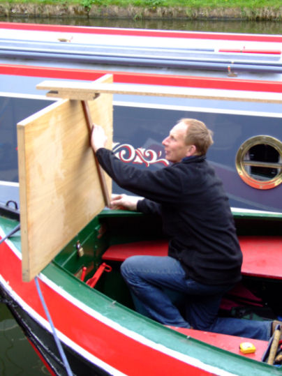 Saturday the 21st April was the day before the 2012 Opening Cruise and also the date of the Opening Cruise Dance. Before the dance Ian made a template for the cratch board out of scraps of timber from the woodwork shed. We discussed the possibility of making it out of steel but it would be more difficult to glaze so timber was agreed on. Liam Hewlett of Longford Canal Services punctuated our afternoon when he came past steering "Ariel" with their new butty... an ex-BCN "Joey" day boat, breasted-up alongside.