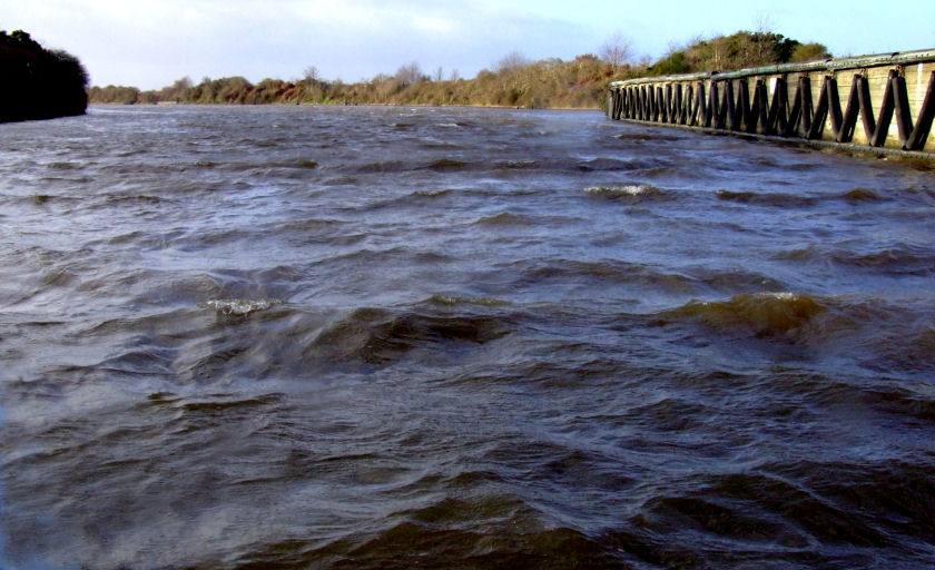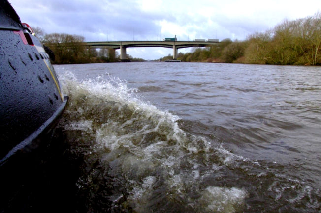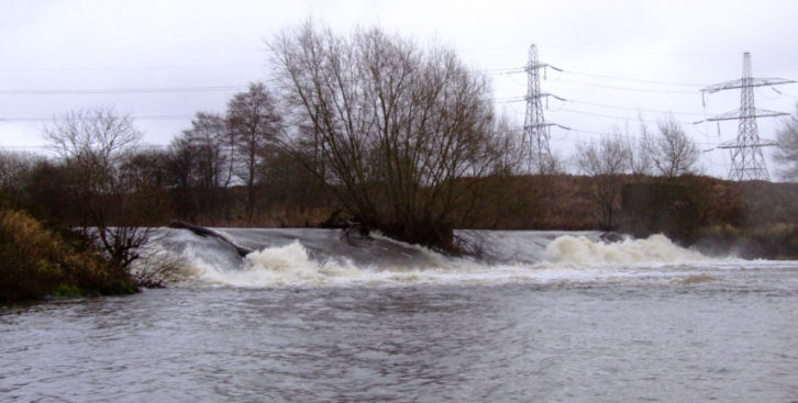 The River Mersey running from the right to Woolston Weir in the centre