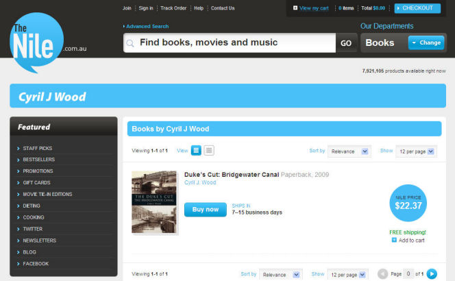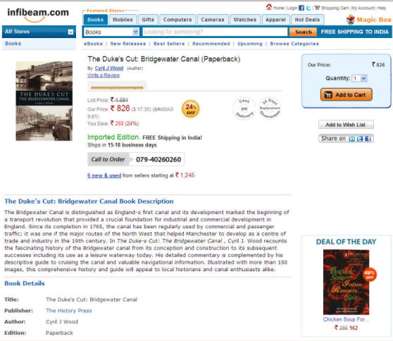 In Canalscape Book 7 I mentioned that my books were on sale in New Zealand on the Mighty Ape website. Whilst "Googling" my book titles to check metatags I noticed that they are also on sale in Australia at Nile.com (AU$22.37) which is Australia's largest bookshop and in India at Infibeam.com (ζ826 - Rupees) the format of whose website is suspiciously "Amazonian". It is really strange to see the books advertised for sale on the other side of the planet and at prices displayed in unusual currencies.