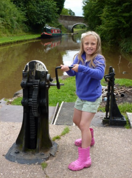 After shopping we returned to the boats and set off. In Betton Wood we had to negotiate around a tree that had fallen into the canal. Again there was no sign of the shrieking ghost but we were treated to the sight of a kingfisher swooping low across the canal, landing in tree branches and swooping across the canal again. Even though I had my camera to hand these elusive birds are too quick to photograph from a moving boat... even if it was doing much less that 4 mph! Next stop was Adderley Locks. As Shannon was a bit older and we allowed her to help on the locks. In fact she can actually wind a ground paddle up provided that it isn't too stiff. She was doing well with the ground paddles and opening the gates but the gate paddles are too high for her to manage. Audlem Locks followed soon after and adjacent to the top lock were cows and a bull in the field.
