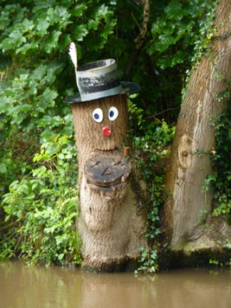 Our next port of call was Market Drayton which we planned to reach the next day. As we entered Grub Street Cutting it started to rain and half-way through the alternator drive belt started to scream. I pulled over, moored the boat with the centre rope. This is one of the nightmare jobs on "Total Eclipse" as to gain access to the bolts securing the alternator the steel steps from the rear deck have to be removed and then one needs to be a contortionist in order to reach the alternator. The belt was eventually adjusted and everything put back then we were on our way again. We negotiated Tyrely Locks in the pouring rain and it wasn't until after the locks that the rain stopped. In the wooded cutting after the locks was a piece of tree sculpture that made me smile. It was the face of a man wearing a hat. This is the second piece of tree art that I have seen in recent months but I can't decide which is the best.