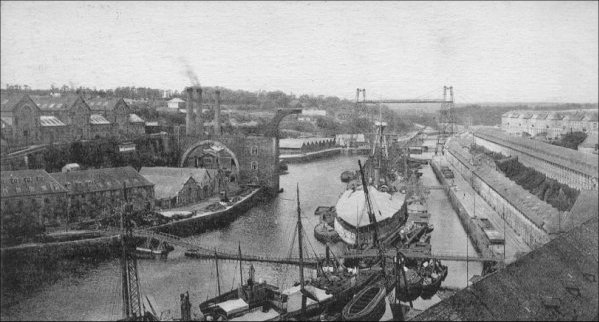 This photograph shows the French Naval Base at Brest in the foreground with the transporter bridge in the far distance.