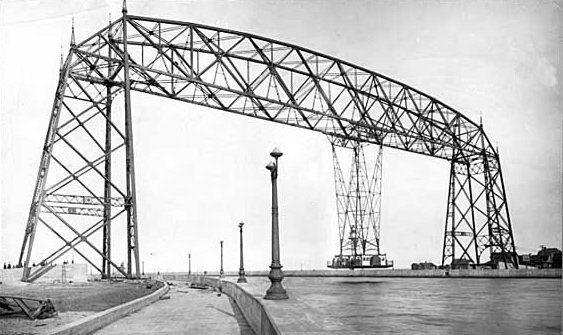 The earlier 1902 bridge was complemented by a second bridge built to the cantilever design with a suspended, electrically operated platform in 1912 that could accommodate road vehicles as well as railway trucks.