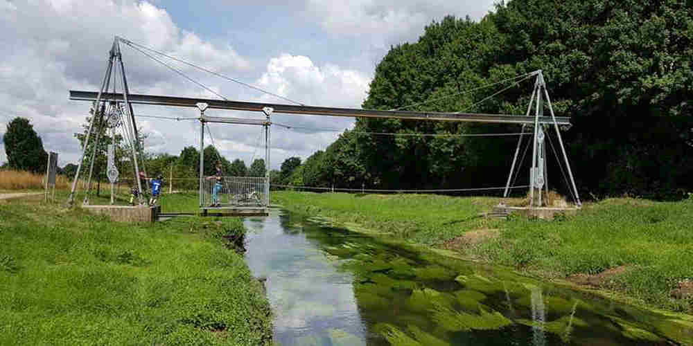 Another cable-stayed transporter bridge constructed in 2003 is located at Erlebnisbrücke, Mönchengladbach, North Rhine-Westphalia, Germany. The bridge spans the Canal Neue Niers which connects the rivers Rhine and Meuseand. It is the smallest of the transporter bridges listed with a span of approximately eighteen metres crossing a waterway that is eight metres wide. The frame is made from steel and the gondola is 1.5 by 2.5 metres and is only capable of carrying no more that five passengers or two bicycles. The gondola is powered by hand with the passengers hauling on a rope to move the gondola. Details regarding this bridge are sparse but it appears that the bridge was constructed by Marco Baum... an architect and teacher.