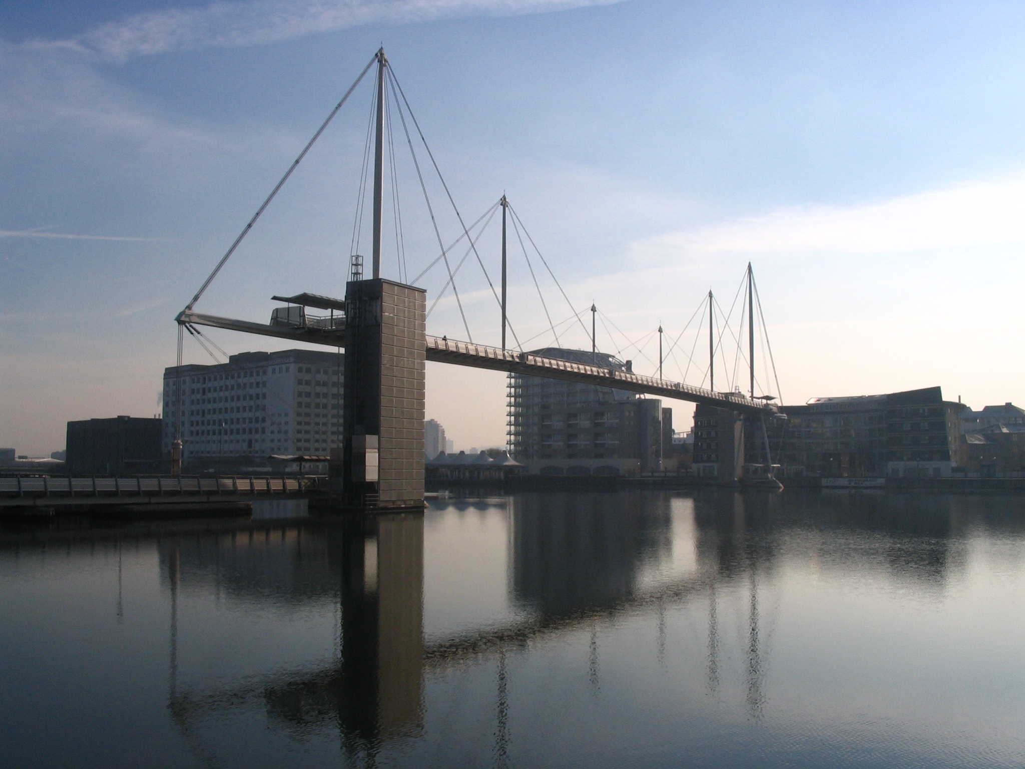 A new footbridge across the Royal Victoria Dock in London has been constructed with the capability of being converted into a transporter bridge at a later date. The bridge is primarily a conventional pedestrian footbridge and when the nearby development is completed, the 200 mtrs long footbridge will be converted into a small pedestrian transporter bridge.