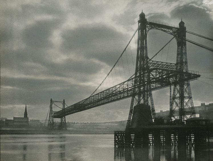 A beautiful, moody Chambre Hardman photograph of the Runcorn-Widnes Transporter Bridge