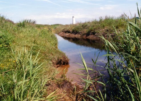 The way across the head of the peninsula to the sea is now barred by the landfill tip at Bidston Moss (now a nature reserve), although the River Birkett circum-navigates the large man-made mound and winds its way behind Leasowe where there is a confluence with the River Fender. The Birkett springs from the ground and feeds a lake in the nature reserve behind Leasowe Lighthouse.