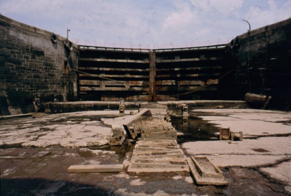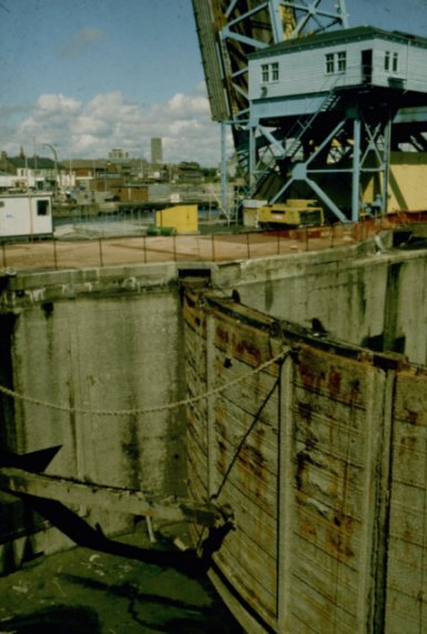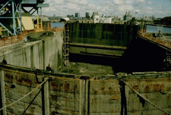 The dry-dock entrance lock gates seen from the floor of Bidston Dry Dock