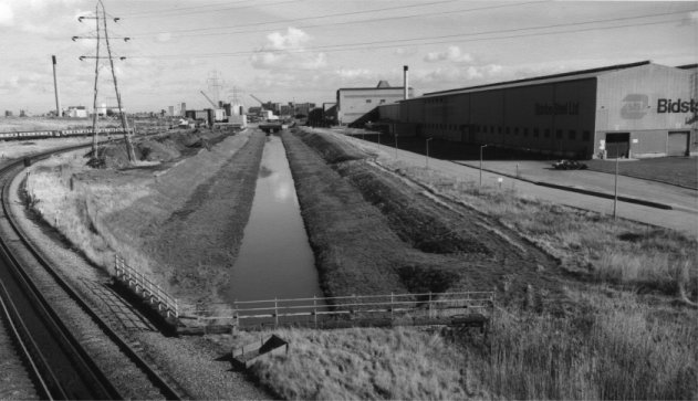 The River Birkett running alongside Bidston Steel - now a Tesco Superstore