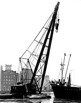Railway locomotives being lifted onto a ship for export at Cavendish Wharf/Gilbrook Basin