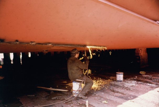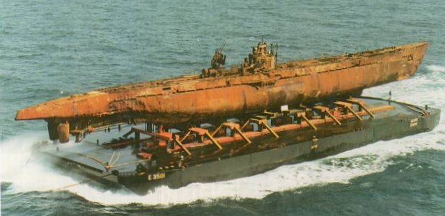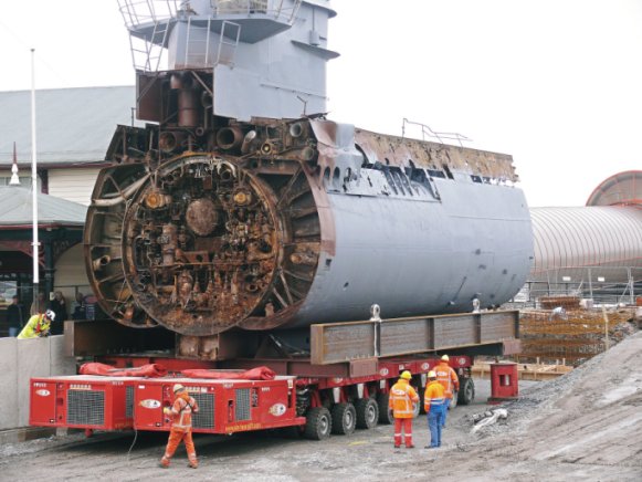 The centre section of U534 being manoeuvred into position on a remote controlled bogie