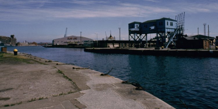 Immediately after the Duke Street Bridge, on the Birkenhead side of the West Float was located a pair of “Swan Neck” cranes serving loading/unloading berths for various commodities ranging from bulk powders to newsprint. These cranes were local landmarks for many years until they were demolished on Sunday the 27th April 2008. The warehouses on the opposite side of the docks have been leased for purposes not connected with the docks. The docks curve around the right and on the left is derelict land once the location of yet more flour mills... this time belonging to Ranks in the shape of their "Ocean Mills"