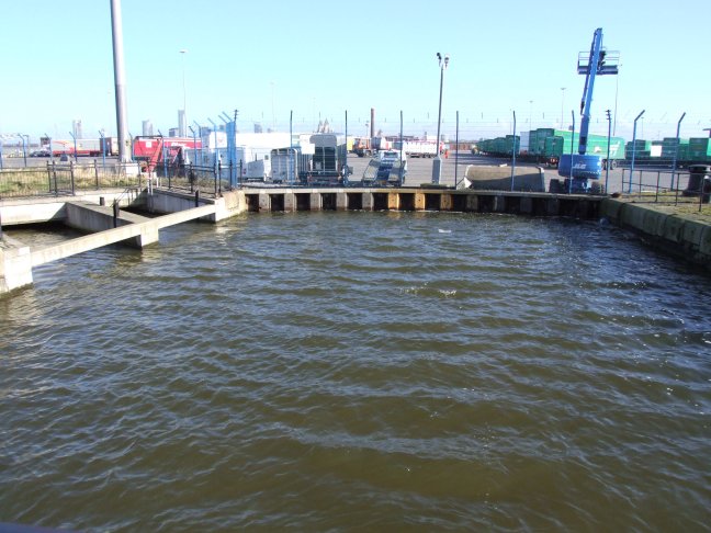 At the side of the Mobil Oil plant is a small loading wharf. It is no longer in use but at the far end of it, the River Birkett runs into the docks system after being culvetted from behind the British Rail Motor Traction Workshops.