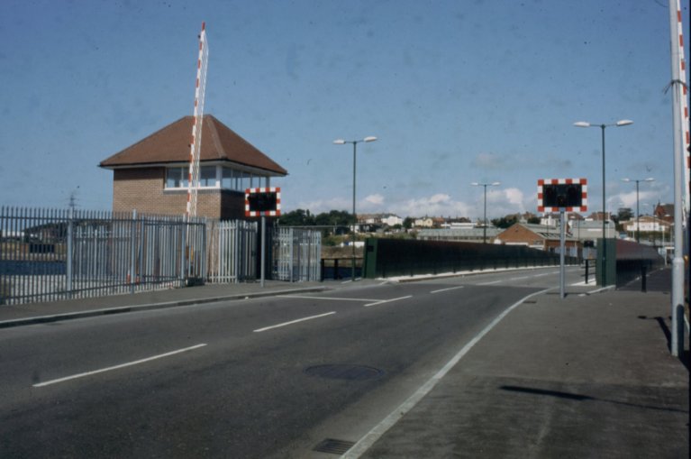 The Bidston Dry Dock entrance gates with the disused Mobil Oil Plant on the right