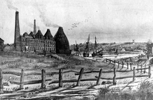 This artwork of the pottery exhibits quite a bit of "artistic licence" as it shows Bidston Windmill close by