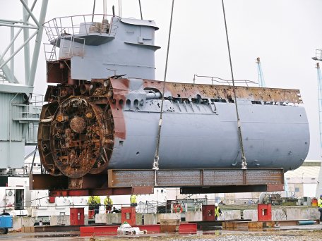 The first section to be moved was the centre section containing the conning tower. It was lifted from the quayside on Monday the 10th March and delivered to it's new home on the same day. The other four sections followed shortly afterwards. During the initial inspection of the U Boat, two M4 Enigma cipher (coding) devices were discovered as well as other artefacts relating to WW2 naval warfare. These are part of a display in the new appreciation centre at Woodside which opened during in February 2009.