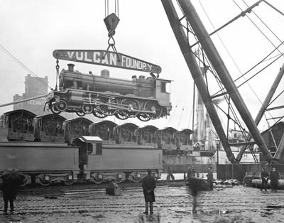 The photograph below shows locomotives from the Vulcan Foundries in Newton le Willows at Cavendish Wharf/Gilbrook Basin, adjacent to the Rank Ocean Flour Mills being loaded onto a ship for export.... probably South Africa.
