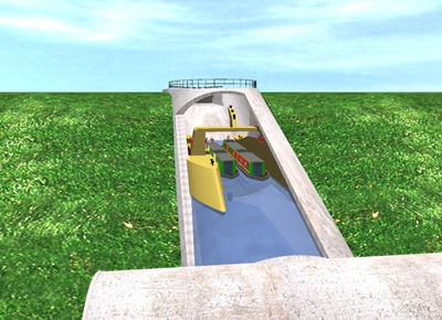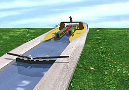 Another revolutionary device for raising and lowering boats without the need for conventional locks is the Diagonal Lock. It is a cross between an inclined plane and a water slope (as used on the Canal du Midi) and could be the answer to canal restorers' prayers when a stretch of canal has to be realigned and a steep change of height is required. Boats would be raised or lowered through a diagonal tube that is filled or emptied of water depending upon the direction of travel. The brainchild of Terry Fogarty it has the support of British Waterways, was featured in the "Waterworld" TV series and could be an attraction on restored waterways in the future. For more information and an excellent animated demonstration go to go to http://www.diagonallock.org.