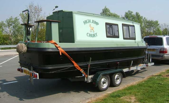When we were travelling to Paris with Lymm Cruising Club in 2007 our coach pulled in for fuel and a comfort break. Whilst walking around to stretch our legs we saw High Jump... a Sea Otter, lightweight narrowboat of aluminium construction rather than the heavier and more corrosive mild steel. The boat emanated from Churt, which is near Farnham in Surrey on the River Wey and was on a trailer towed by a large 4x4. Its owner was, no doubt, emulating Terry Darlington's epic voyage to the Mediterranean ("Narrow Dog to Carcassonne") but missing out the bit where Terry, Monica and Jim the Whippet crossed the English Channel in their narrowboat Phyllis May.