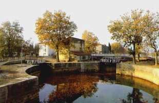 The Round Lock at Agde is unique inasmuch as not only is it circular but it incorporates a junction with the Canal du Garonne. It has three sets of gates locks with multiple exits at different levels... one for the main line of the Canal du Midi to Sète, one for the Canal du Midi leading to the Garonne River and the other for the Canal du Garonne (Canal du Lateral) leading to Béziers and eventually Toulouse. Subsequently, it must be one of the most unusual canal junctions in the world. In the 1970's it was modified to accommodate craft of the Freycinet (large French barge) gauge (38.5 mtrs by 5.05 mtrs) and, as can be seen in the left hand photograph below, is no longer completely circular although the extended side wall of the lock does remain semi-circular.