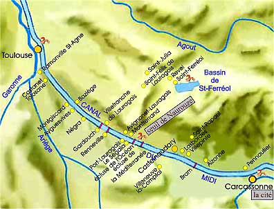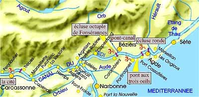 The canal was to run 240 kms from Toulouse in the north to Sète in the south. At Toulouse the canal connected to the River Garonne which runs into the Atlantic Ocean at Bordeaux. At Sète the canal connects to the Mediterranean Ocean via the Etang de Thau... a large tidal basin separated from the Mediterranean by a narrow isthmus or strip of land with an opening to allow shipping to reach to the port constructed on the Island of Sète within the basin.