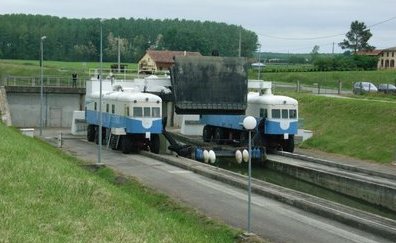 We cannot match the European's when it comes to the scale of their waterways and the complexity and lateral (as well as vertical) thinking used in some of their features. For instance... whilst we only have two operational boat lifts at present in the UK, in Europe there are many. The largest number of chambers in a British staircase lock is normally five but "Neptune's Staircase" on the Caledonian Canal is exceptional in having eight. The French also have one that features eight chambers at Fonserannes (although the eighth chamber is now out of use) giving a rise of 21.44 mtrs and at the same location, as an alternative to the locks is an unusual inclined plane or "water slope" where the water complete with craft floating in it is pushed up a hill. The water is contained by a flexible seal around the movable "gate" at the bottom of the slope. The "water slope" was constructed in 1987 and is similar to one at Montech.
