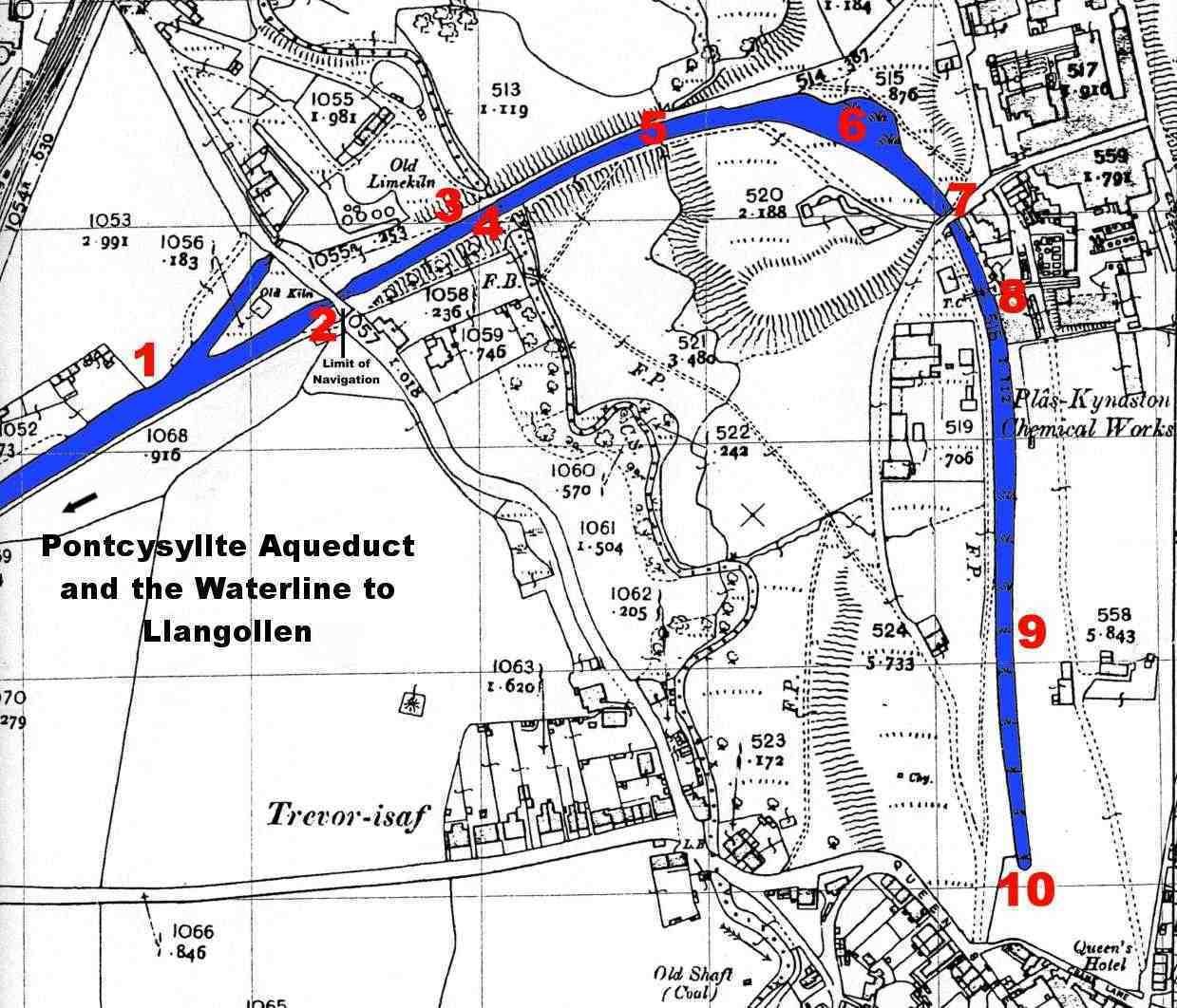 A story that was related to me recently by a Flexsys employee tells of a large mobile crane coming into the works to provide heavy lifting facilities to remove some metal storage tanks. The crane was parked to make the lift and one of the site’s longest serving employees came and informed the engineers that the crane could not be parked there as it was on top of the old canal bed (8) and it might collapse under the weight. Needless to say, the crane was hastily moved to a more stable location before the lifting took place. The tanks that were removed sat on steel girders placed over the line of the canal to prevent the tanks foundations subsiding. From here the canal ran in a straight line (9) and finished close to the boundary fence at the Ruabon Village end of the plant (10).