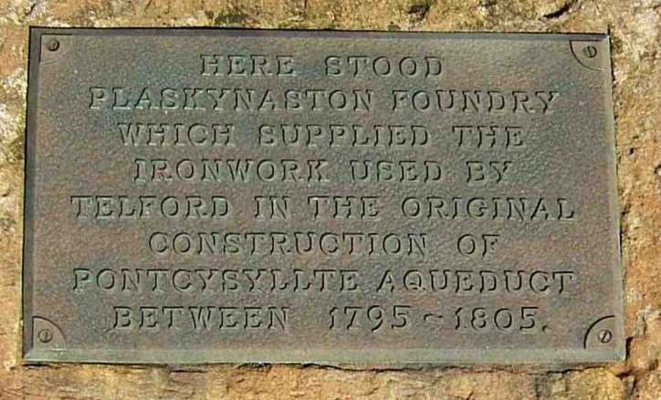 The location of the Plas Kynaston Iron Foundry is remembered by a plaque within the Ruabon Works complex which was later the home of Monsanto Chemicals before then Flexsys Rubber Products. Within the complex is a commemorative plaque alongside the display of a preserved cast iron roof truss from one the original buildings. The foundry was built specifically for the fabrication of the cast iron plates used in the construction of Pontcysyllte Aqueduct and the partial (when originally built) cast iron trough of Chirk Aqueduct. After casting the plates were transported to the site of the aqueduct along a branch canal that was to originally form part of the Western Scheme. The canal was in use up to the 1940's and possibly later, although it is now in-filled the line of this branch can be seen and traced with the aid of an old map within the Flexsys Complex (formally the Monsanto Chemical Plant).